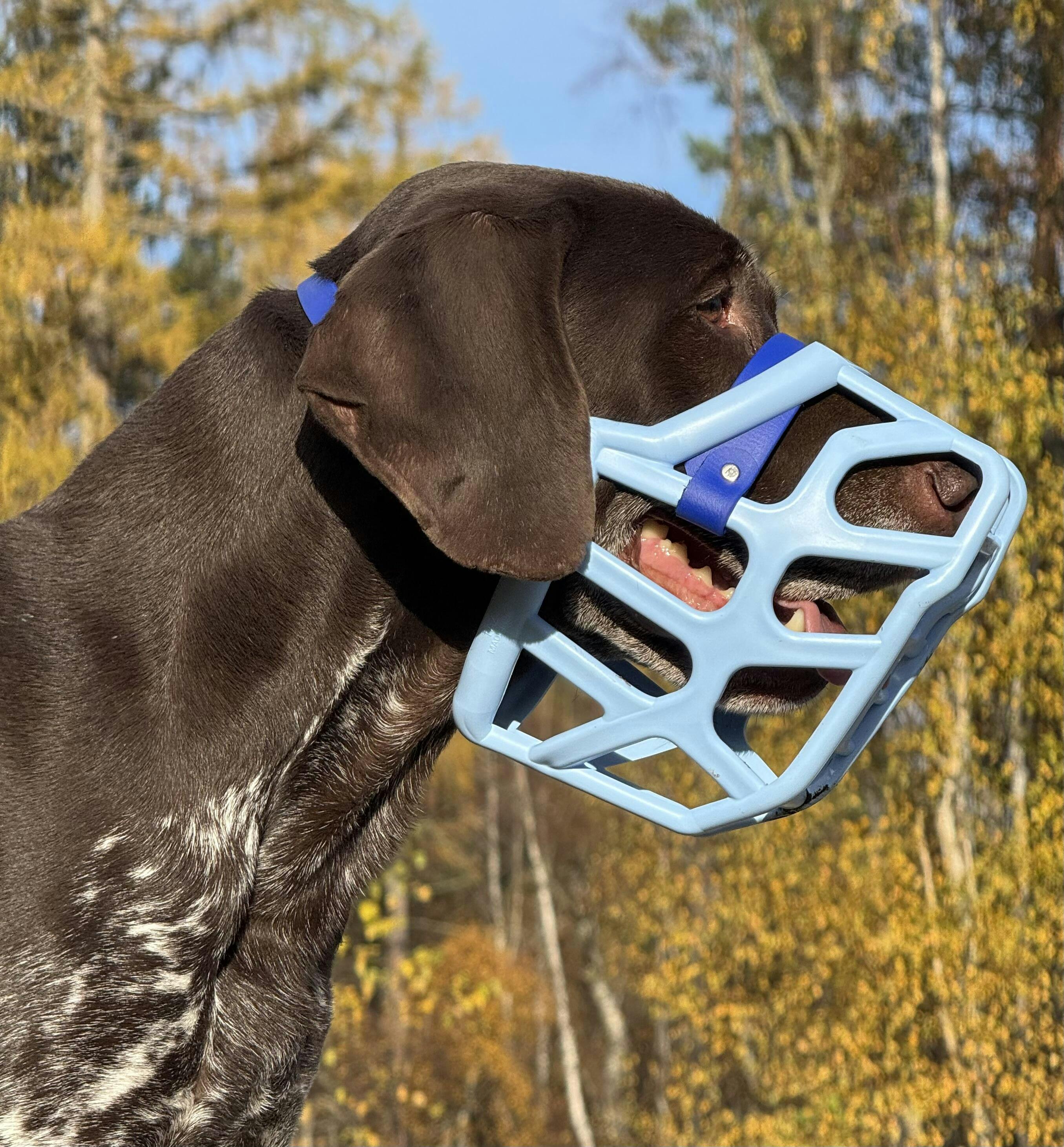 Absolutely love this muzzle. I have a German Shepherd/Malinois mix, it has been hard finding a muzzle that she cant take off, is comfortable in, and can easily stick her tongue out to get treats. She settled into this muzzle after just a few minutes of wearing it. She was not able to take it off. It has plenty of room for her to pant and it even has a space for her nose to peak out just a bit. The muzzle fits perfect & its even soft! I love the colors of it and I lOVE that her tongue can easily come out for her reinforcement treats. I would highly recommend this product.