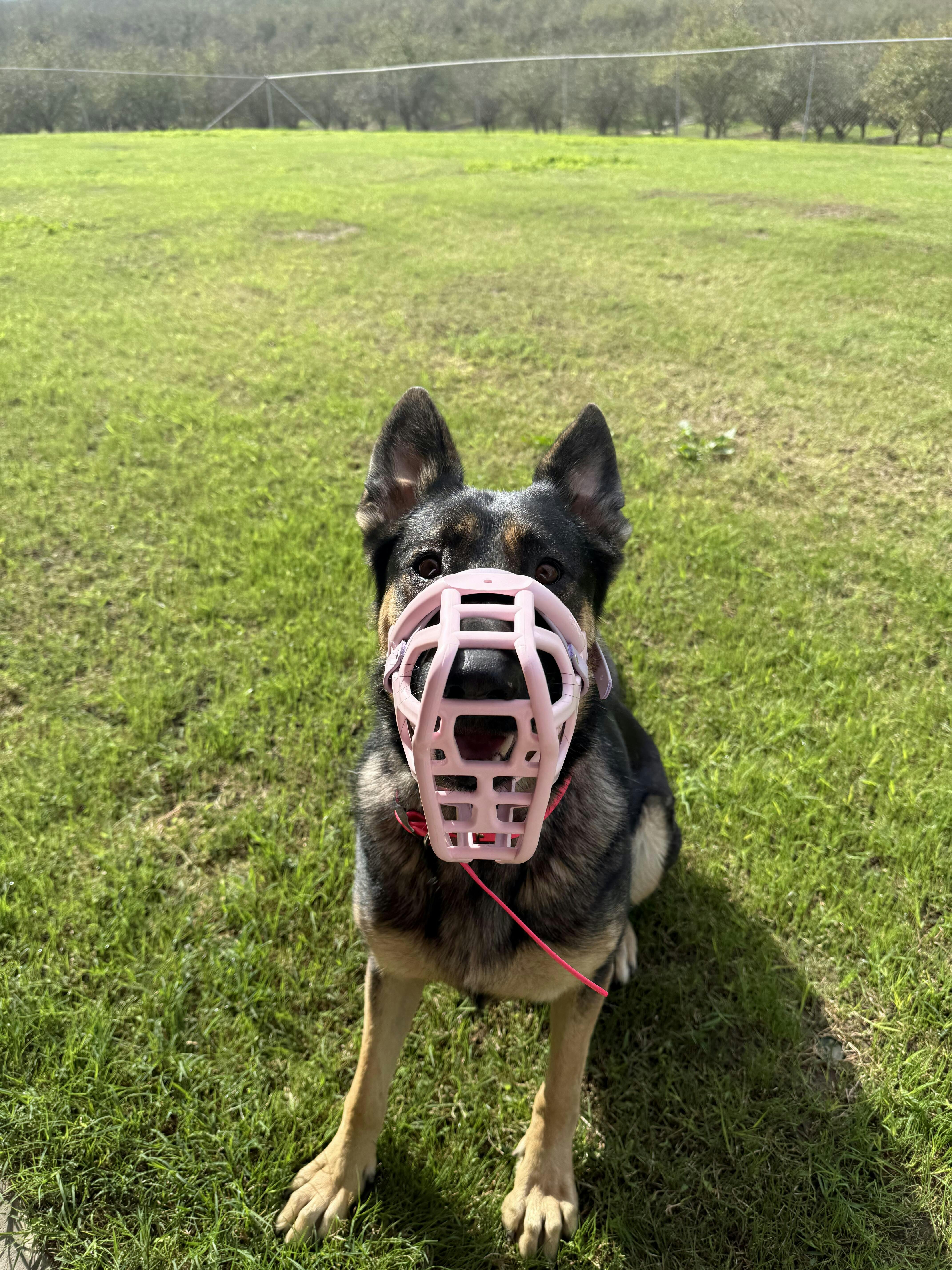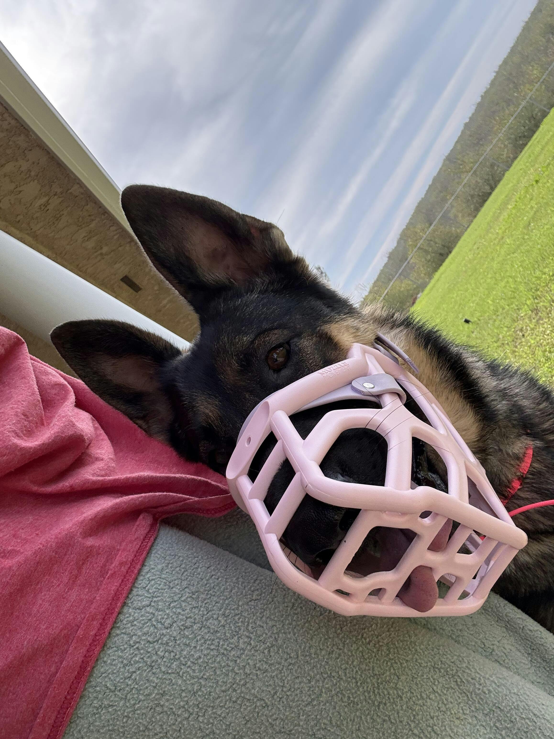 Fits great! Very high quality! She instantly tore off/broke the last muzzle we tried it but this one stays on no matter what and I cant imagine this thing breaking any time soon! She looks so cute in the pink that she doesn’t even look scary like a lot of other muzzles! !