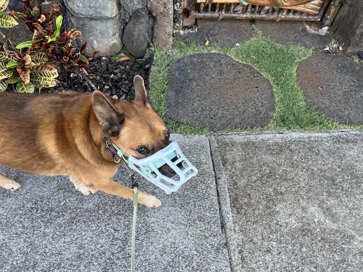 I have a 45 lb Queensland Heeler/Shepheard Mix male. He used to wear a size 3 basket muzzle, and hated it; he would try to "roll" it off every time he wore it. Thus, I ordered the Tolly with a Chin Strap (opted not to do the head strap and think that makes a big difference), Quick Release Buckle, and added nose padding... praying that this would be a better experience for him. This Tolly Muzzle has been a GAME CHANGER and I haven't seen him try to roll it off once. He is so comfortable in it that he even slept in it at the vet. I am forever grateful for the Muzzle Movement team in their quest for better muzzles! I've also received many complements on the beautiful muzzle as well :)