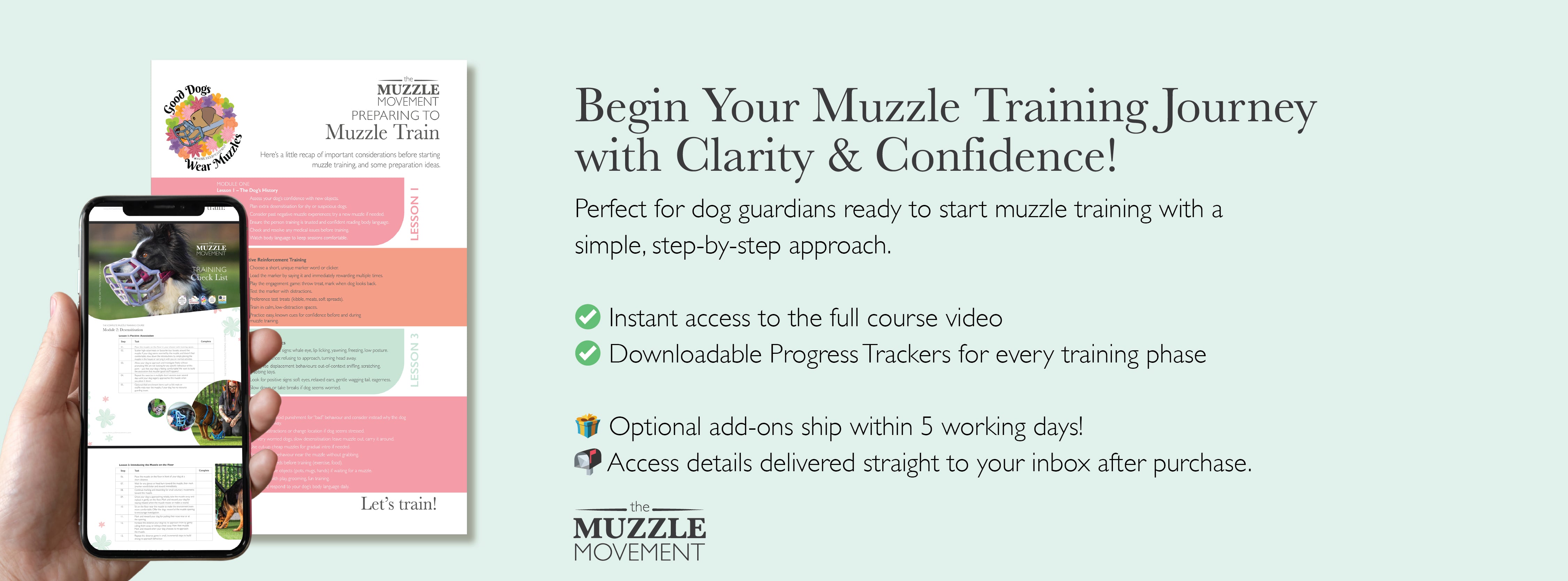 That’s why we’ve created our Complete Muzzle Training Course, now available to buy. This step-by-step program is designed to make muzzle training easier for both you and your dog, giving you the tools, techniques, and confidence to ensure your dog feels secure, happy, and free to enjoy life, muzzle and all.