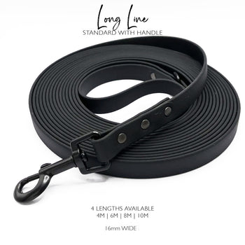 Long Lines: Available in 4m, 6m, 8m, and 10m Length options. Purchase Options: Buy individually or in cost effective bundles of five. Colours: Choose from 19 vibrant Biothane® colours to suit your brand or clientele. Styles: Select between a standard fixed handle or a detachable handle for added versatility.