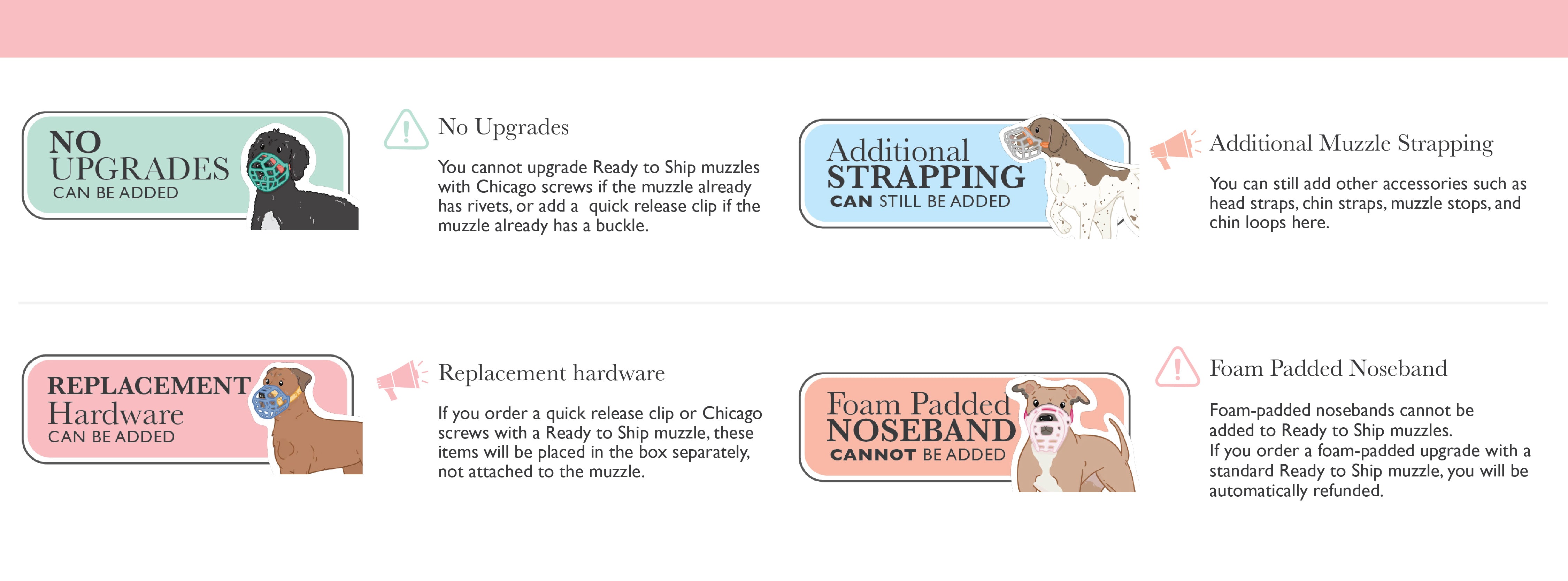 Ready to Ship muzzles are pre-made with the hardware and accessories shown in the associated image.